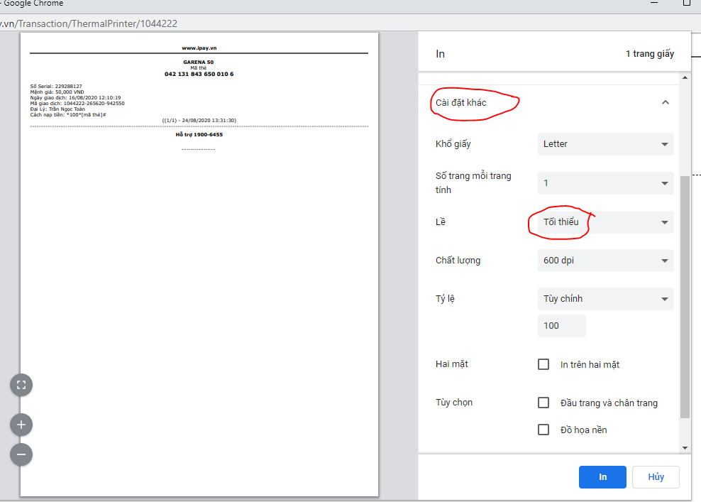 Ở mục "cài đặt khác", đối với thuộc tính Lề: chọn "Tối thiểu". Đối với thuộc tính Tuỳ chọn: chọn bỏ trống ô "Đầu trang và chân trang". Cụ thể chọn cài đặt như hình và bấn chọn "In" để hoàn tất các bước in thẻ.