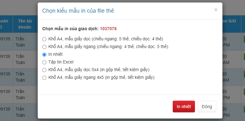 Quý Đại lý có thể xuất thẻ dưới dạng file excel hoặc in thẻ qua máy in. Để in thẻ qua máy in nhiệt, Quý Đại lý thực hiện theo các bước sau: