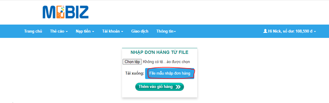 Bước 2: Quý Đại lý tải file mẫu về và điền các thông tin theo yêu cầu và upload file, sau đó chọn Thêm vào giỏ hàng