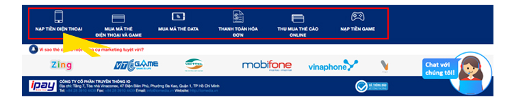 Bước 1:  Quý khách hàng truy cập vào trang chủ theo link https://ipay.vn  và chọn nạp tiền điện thoại.