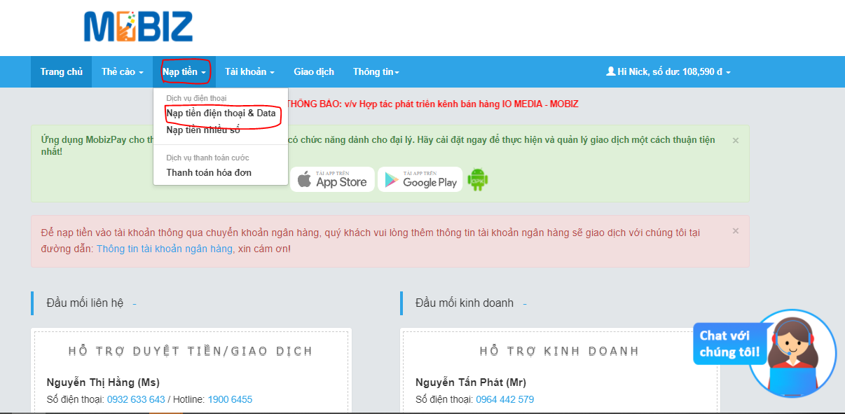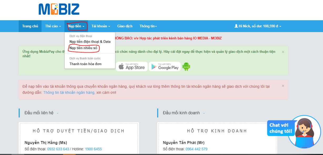 Với tính năng nạp tiền tại đại lý MobizPay, Quý Đại lý có thể nạp tiền điện thoại (trả trước và trả sau) cho tất cả các nhà mạng hiện nay như là Viettel, Mobifone, Vinaphone, Vietnamobile, Gmobile. Ngoài ra, Quý Đại lý cũng có thể nạp tiền DataBài viết này hướng dẫn Quý đại lý thực hiện giao dịch nạp tiền điện thoại đối với hai hình thức là: Nạp tiền điện thoại cho một số và nạp tiền điện thoại cho nhiều số.
