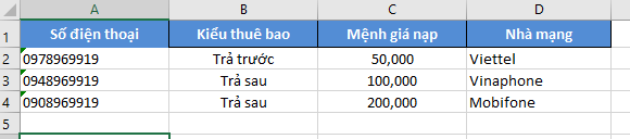 Quý Đại lý cũng có thể upload số điện thoại theo file excel. Các thông tin yêu cầu của file excel như hình bên dưới.