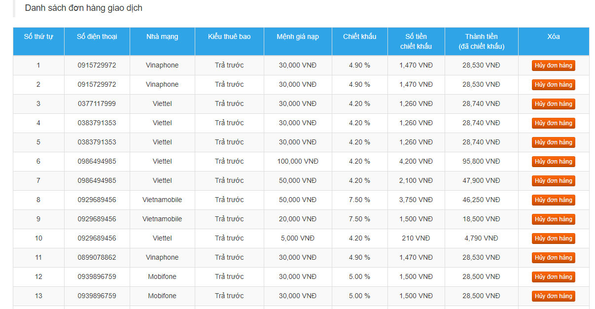 Khi up file thành công, hệ thống sẽ hiển thị tất cả các số điện thoại cùng mệnh giá và chiết khấu khi giao dịch. Ở bước này, Quý đại lý sẽ biết được tổng số tiền cần thanh toán sau khi trừ chiết khấu.