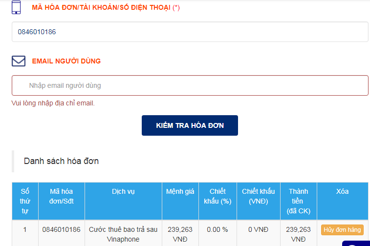 Tiếp theo, điền thông tin mã hóa đơn hoặc số điện thoại khách hàng cần thanh toán. Nhập địa chỉ email người dùng. Sau đó, nhấp vào phần kiểm tra thông tin hóa đơn để hiện thị thông tin như hình ảnh minh họa bên dưới.