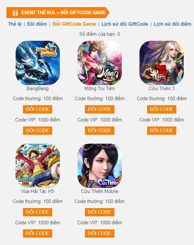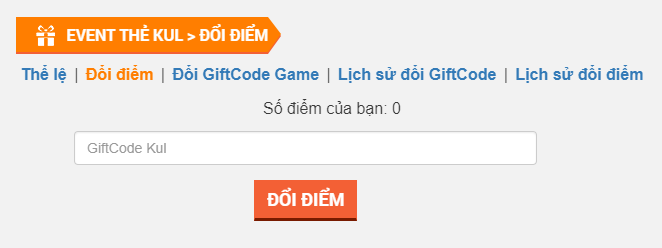 - Dùng mã này để truy cập vào trang: http://event.kul.vn/doi-giftcode-mua-the-kul/the-le.html để đổi điểm.