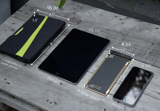 Solar Paper hội đủ những tính năng hấp dẫn: tiện dụng, nhẹ, mỏng, bền và có cả chống nước. Sản phẩm này có kích thước lần lượt 9 x 19 x 1.1 cm (khi gập lại), mỏng chỉ 1,5 mm và có trọng lượng 120 gam, và nó dài hơn iPhone 6 một chút.